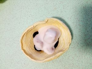 待蛋挞皮室温稍微变软时,去掉锡纸,这里要注意,不能太软,太软去锡纸时容易把蛋挞皮撕坏。可以先用剪刀把锡纸收口处剪开,这样比较好撕。