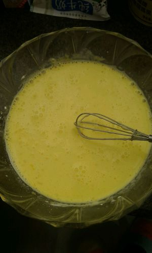 一个全蛋,一个蛋黄,牛奶,淡奶油,白砂糖混合,搅拌均匀。