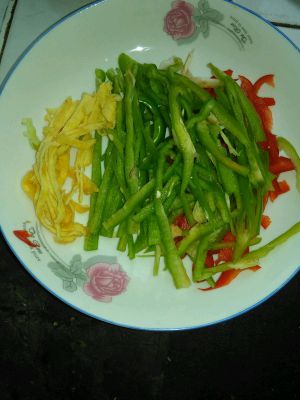 青椒和红椒以及鸡蛋皮切丝备用,蒜和葱切碎备用