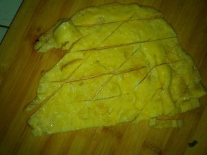 鸡蛋加盐搅拌后放入平底锅中摊成蛋皮,然后切成丝