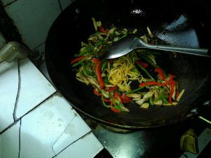 热锅放油,蒜末和葱爆香,再依次放入香菇、青椒红椒蛋皮丝,翻炒,加入盐、味精、鸡精、耗油