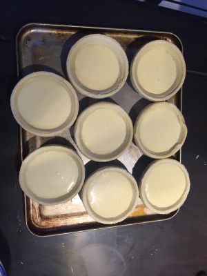 所有材料混合在一起,搅拌均匀,倒入蛋挞皮中,8分满。