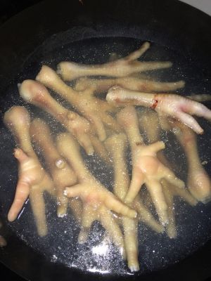 鸡爪,洗净,放入料酒用水焯一下,撇去浮沫。