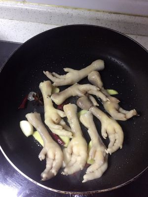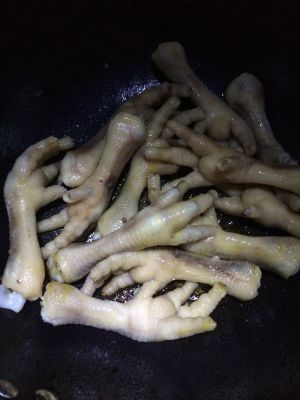 放入鸡爪,快速翻炒。