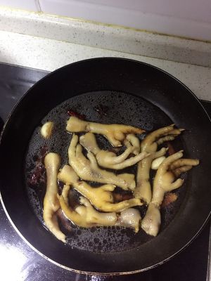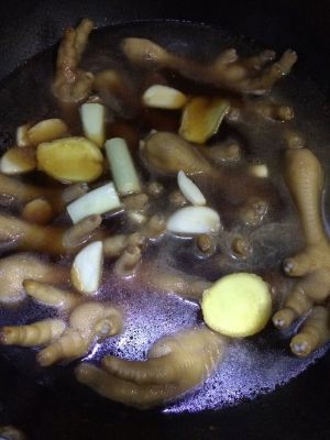 油锅烧热放入姜和鸡爪小火翻炒