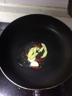 冰糖少许,葱姜蒜,红辣椒,八角,炒香。