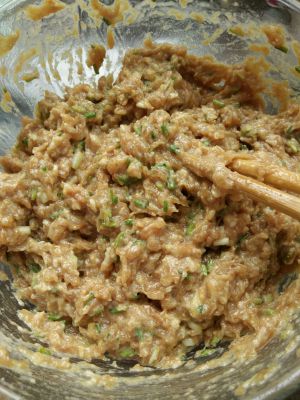 将猪肉剁碎放入青豆玉米粒香菇葱酱油盐