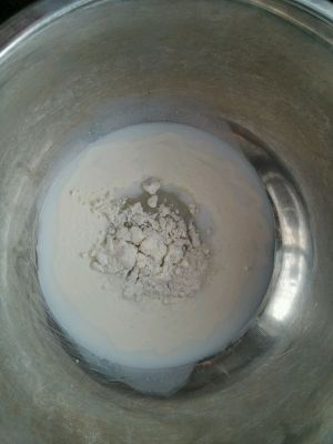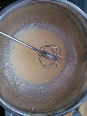 蛋黄搅拌好倒入之前拌好的奶液中。
