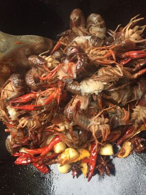 将锅上火,倒入植物油150ml,烧热后将老姜、大葱、红葱头分别下去锅中炒香,再下入各种香料继续炒香,然后放入小龙虾翻炒一会儿,烹入酱油、老抽再翻炒一会儿,加入,高汤,加入盐、糖调口,盖上锅盖,至汤汁收浓为止。