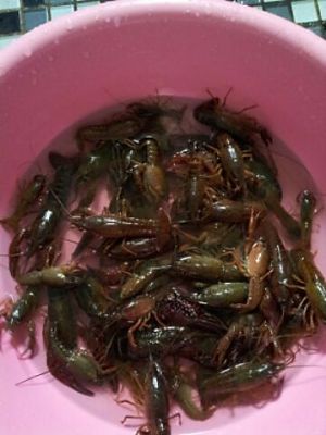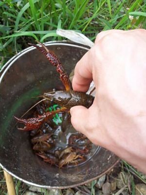 鸡肠甩入小河沟~小龙虾闻到荤腥味即来抢食,会用夹子夹住诱饵~慢慢拖出水面,用力一提,丢入桶内(若有小网兜事半功倍呀)