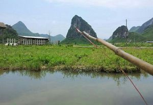 小桶一个,竹竿一两根,绳子绑住一头,另一头绑住剪断的鸡肠。