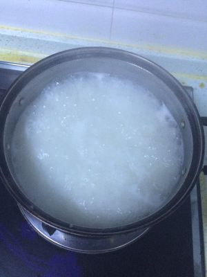 水滚后加入搅拌食用油的大米入锅,要注意用汤勺搅拌哦,否则会糊底哦 大火煮米直至大米开花后加入腌制好的肉丝,+皮蛋煮10分钟左右+盐喜欢鸡精的可以加点鸡精,我不喜欢鸡精所以没有加,出锅前+葱花即可