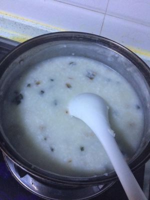 大米泡半小时后加几滴橄榄油、一勺盐煮半个小时,用勺子搅一搅,大米煮开花后,加入准备好的材料,开锅后加一勺盐、半小勺鸡精,转小火再煮十分钟。出锅后撒点葱花。
