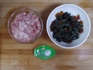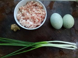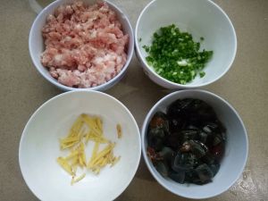 首先,要把食材切好。把瘦肉剁成肉末,皮蛋切丁。然后把姜和香葱都切碎。