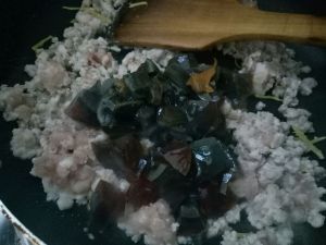 放入皮蛋翻炒。然后调味放盐,也可以放一点酒,去腥味,放点生抽。熟了就可以起锅倒入煮好的粥,然后等粥沸腾放点鸡精,最后放入葱花,就可以关火了