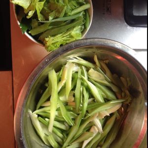 芹菜大葱切段,姜大蒜切碎末。把大虾去头。