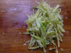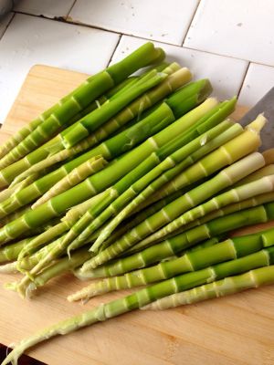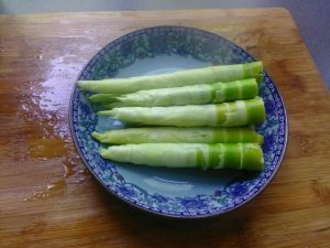 竹笋盐水煮,去麻涩味。捞出冲凉水,拍扁切段。