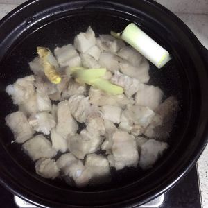 捞出烫过的排骨洗净放入砂锅,放入水,姜,料酒,大葱可放可不放,个人爱好