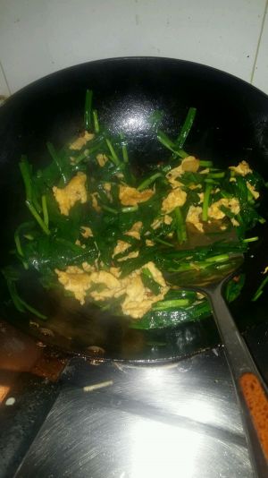 放入韭菜翻炒,有点塌以后放一勺料酒,适量酱油,酱油是主要调味品,不再放盐和其他调料了,随意适当多放些,放入刚炒熟的鸡蛋翻炒,关火。注意要快,韭菜不能太大火!