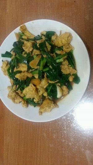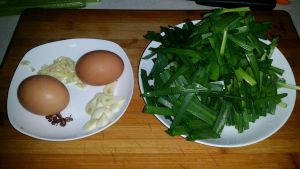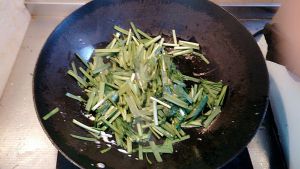 锅内放油,放入韭菜炒至变色,放入鸡蛋后,再撒入少许盐即可出锅;