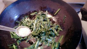 韭菜洗净切小段,倒入锅内,大火翻炒。
