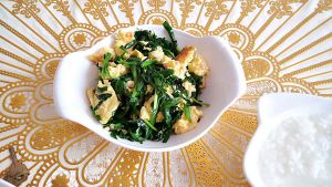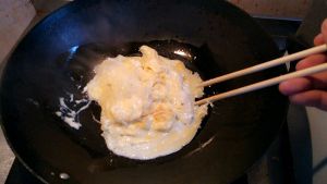 锅内倒油烧热,倒入鸡蛋炒好,锅铲切块。