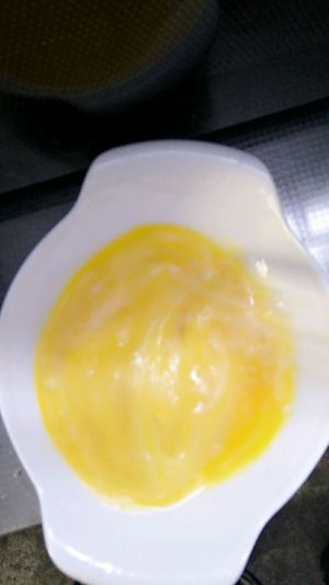 鸡蛋加一勺水,打散。这样炒出的鸡蛋会比较滑嫩。