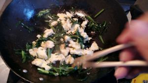 (最好小火和中火)将锅内倒入一勺油,热了之后将搅拌好的韭菜鸡蛋倒入,过十秒,翻过,避免糊锅,之后鸡蛋几乎全部成型,倒入一小碗水,放入半勺盐,如果喜欢咸,可以再放入几勺盐