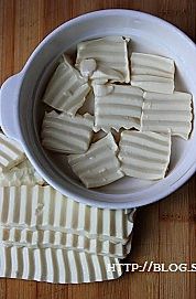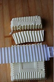 内酯豆腐切成片(请无视花纹,俺纯粹闲得在这凹造型)