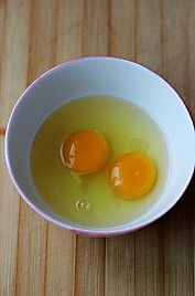 两个鸡蛋打散,加入同样多的水,加一点点盐,打匀