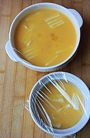 盖上保鲜膜,放蒸锅里蒸,大火烧开转中火蒸至蛋液表面微微凝固