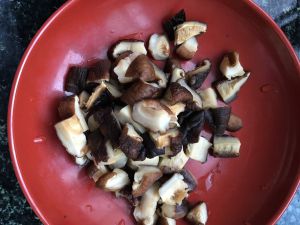 新鲜香菇洗净切成片,胡萝卜切成丁,姜切成丝,香葱切成葱花,备用。