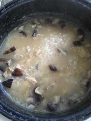 粥熬烂后倒入香菇煮熟,加入肉末搅拌,肉熟了关火,加入葱,调味就好了。