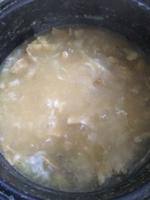 粥熬熟加入腌好的鸡肉,熬10分钟