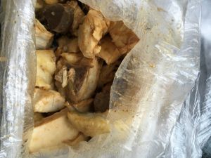 鸡肉猪肉加姜剁成泥,加入盐,料酒,一点酱油腌制。