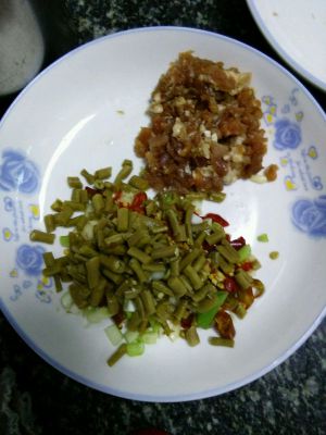 瘦肉,豇豆,辣椒,蒜,葱,分别切好备用