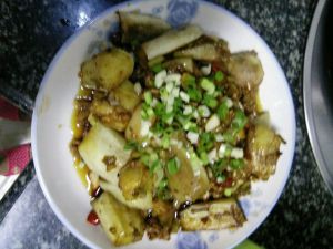 锅里放菜油烧热后,放入茄子炸至金黄备用捞出来,然后把切好的配料放入锅里烧香,最后放入茄子,放点盐,鸡精,酱油提色装盘,撒上葱花就大功告成了