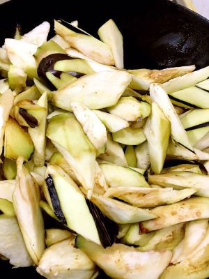 茄子去皮切成小块,放入适量油,中小火煸炒至八成熟。