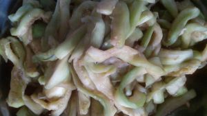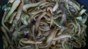 茄子一般都是带皮吃,这一次为了口感把皮削掉了,切成条状,用盐腌上10分钟,然后把水攥出来备用。