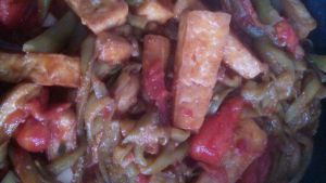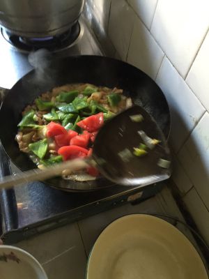 然后再放西红柿和青椒,翻炒一会,放入调好的汁,再放些香油