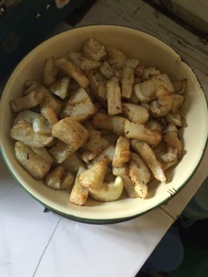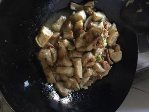 北豆腐切成条儿,用油煎成金黄色,备用。