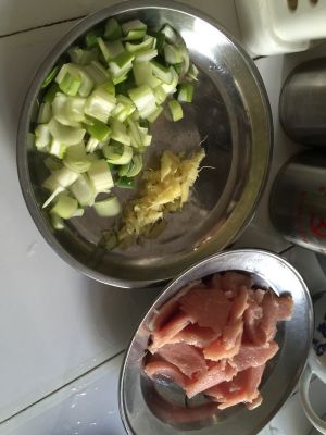 葱姜切碎,里脊肉切条
