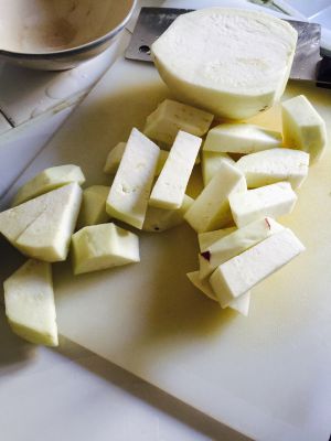 柿子用开水浇一下,把柿子皮扒掉,切块儿备用。