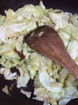 第三步:锅里倒入适量的油,烧至七成热倒入备好的佐料,炒出香味加入适量酱油后倒入包菜翻炒。倒入适量盐,鸡粉