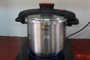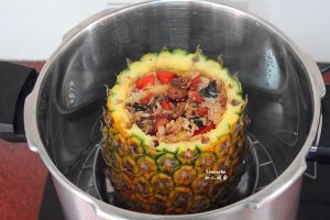 装好的菠萝饭放入压力锅中隔水蒸;PS:因菠萝太大,无法盖上菠萝盖;