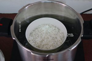 糯米、大米洗干净浸泡2小时,捞出放在大陶瓷碗中加入适量的清水,放入压力锅隔水蒸熟,蒸熟约需要8分钟,放凉待用;