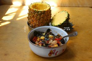 蒸好的米饭放凉捣散、圣女果洗干净切丁、葡萄干洗净、红枣片洗干净、枸杞洗净发泡、放红糖、海苔切碎一起拌均装入菠萝“碗”中;