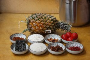 配料用水浸泡过夜。菠萝对半切开,将菠萝中间的果肉用刀和勺子挖出,在盐水中浸泡十五分钟,拌入米饭。