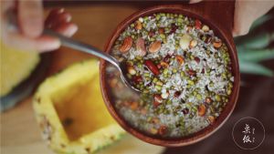 将搅拌好的米填到菠萝中,上屉蒸25分钟,撒上杏仁,用薄荷叶装饰即可。
