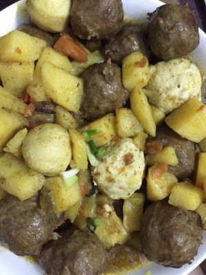 锅内热油放入土豆煸炒一会儿,放入少许盐,随后放入牛肉丸鱼丸一起煸炒,再放入咖喱酱一起炒匀,最后放入水没过土豆和牛肉丸,中火焖5到10分钟,最后收汁起锅装盘,撒入少许葱花就OK了。